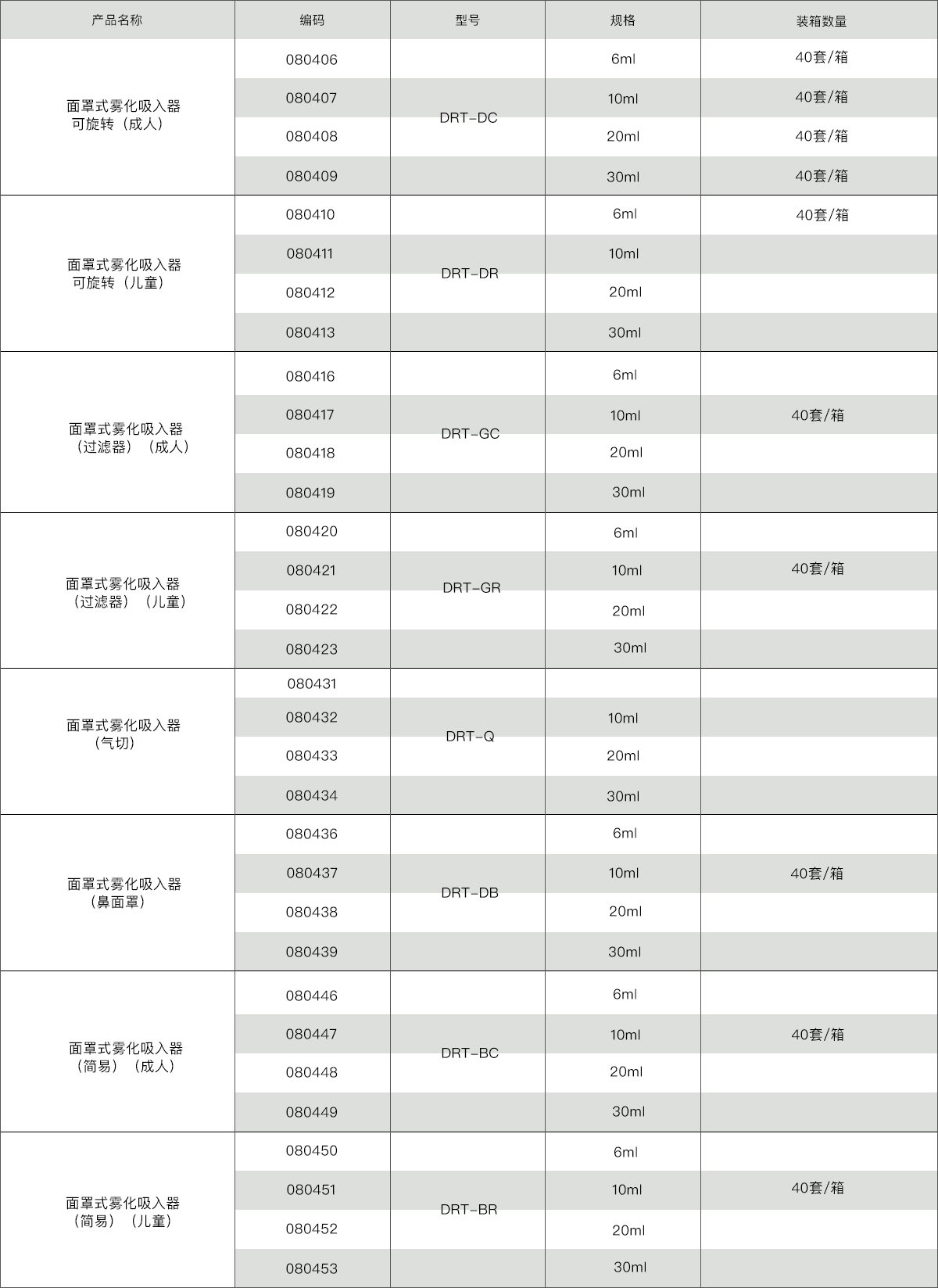 2. The product comprises oxygen tubing, a nebulizing cup, a nebulizing mask, a tracheotomy mask, corrugated tubes, rotatable connectors and an air filter, and is individually packaged.